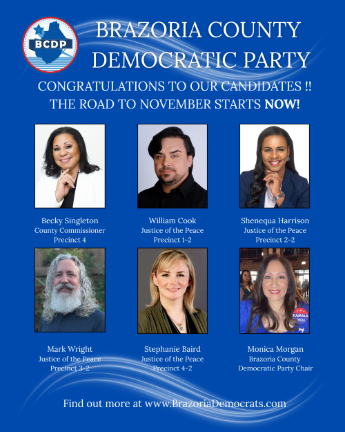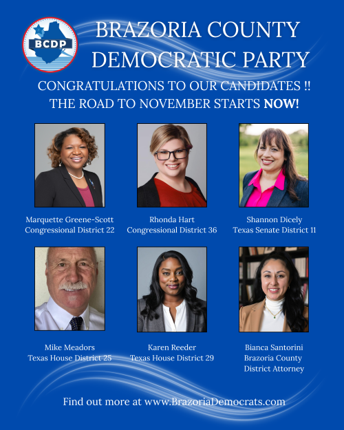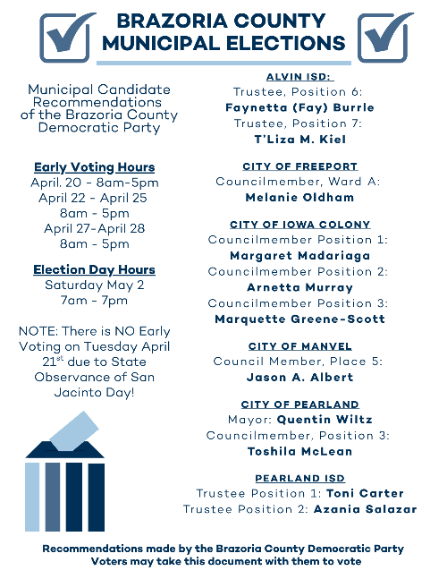 School Board and City Council elections are underway. These elections decide who will guide our public schools, protect community resources, and ensure every family has a fair shot. These local offices influence equity, transparency, and whether public institutions serve all of us. The Brazoria County Democratic Party encourages every voter to learn about the candidates, review our published endorsements, and participate in this important election.